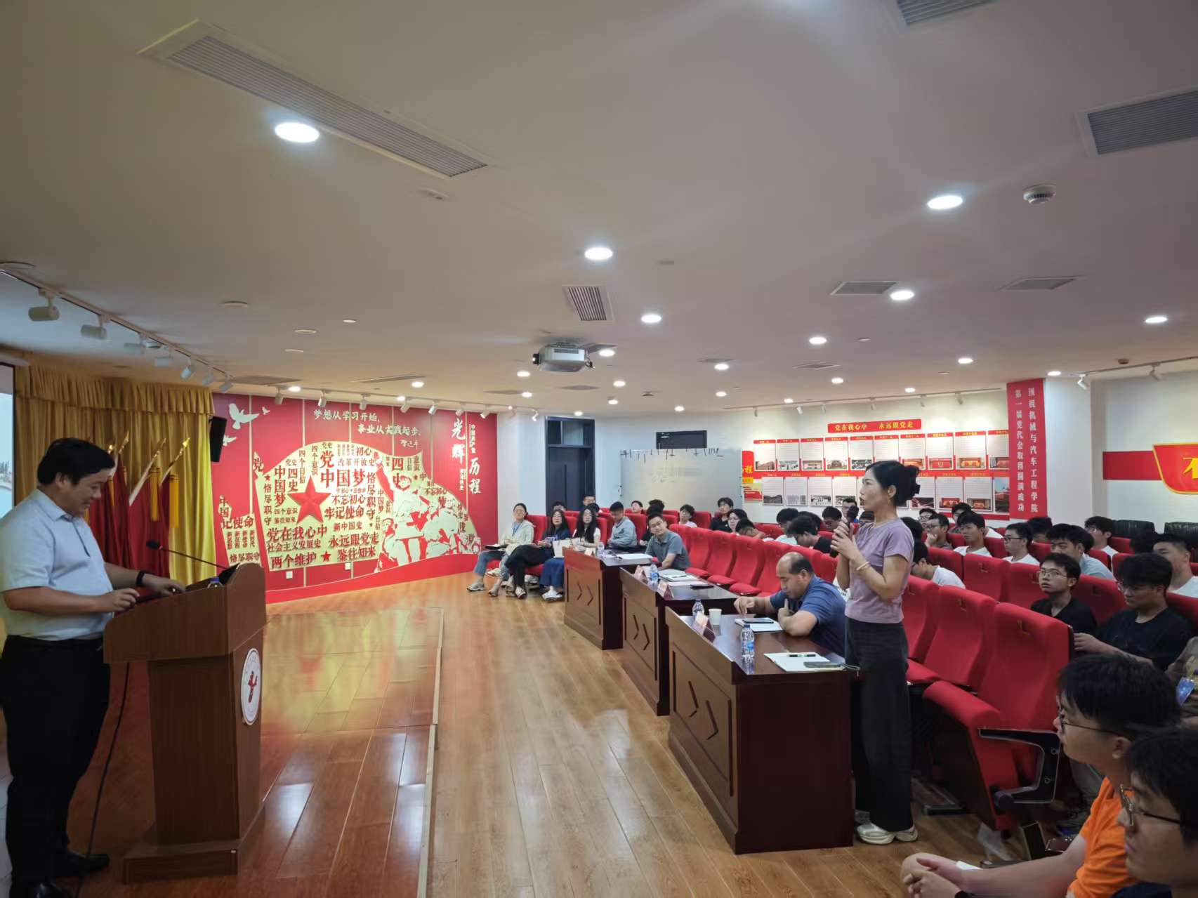 王长波教授以《面向行业数字化转型的具身智能应用与实践》为题,结合自身研究经历,系统回顾了人工智能的发展历程,梳理了从蒸汽机、电力到大数据的技术革命脉络,以及经济形态从农业经济、工业经济向数字经济的跃迁。基于新时代数字化转型的背景,王教授强调技术变革是对国家发展的重要推动力。他指出,现代机器人具备具身智能能力,包括感知、推理与执行,并深入剖析了人工智能的工具属性。在互动交流环节,师生围绕具身智能的伦理规范、技术落地成本控制等议题展开热烈讨论。王教授耐心解答了关于算法可解释性、人机协作安全边界等问题,并鼓励青年学者立足行业实际,深入真实场景中去发现问题、定义问题、解决问题,实现技术创新与产业需求的双向驱动。
