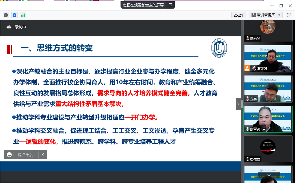 为培养现代产业发展所需的高素质应用型、复合型、创新型人才,推动学院转型特色发展,12月21日,我院举办智能机器人现代产业学院研讨会。会议邀请上海大学教务部常务副部长彭章友教授及我校质量办副处长姚红光老师作报告,永利3044noc院长方宇教授、副院长张立强、副院长刘新田、机电系主任熊根良、机制系主任张海峰,以及相关系室教师参加会议。会议由方宇院长主持。